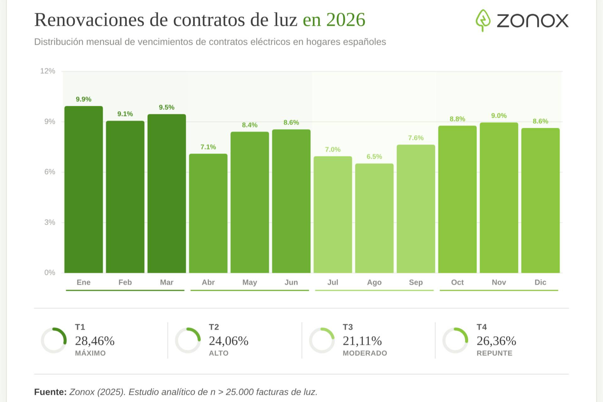 Según el análisis del auditor independiente, el 28,5% los hogares españoles tiene el vencimiento de su contrato en el primer trimestre del año, el periodo de mayor concentración de renovaciones, muy por encima del segundo trimestre (24%) o el tercero (21,1%).